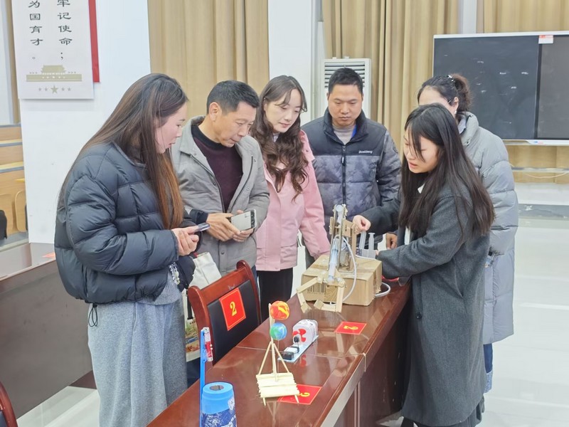 报告会结束,科学教育专业学生科技成果展示区的《地球为什么会转》《蔬菜水果王国》等自制科普书,等离子炮、抛石机、地球圈层结构模型等自制教具,吸引了与会教师目光,大家纷纷驻足观看、拍照、操作。